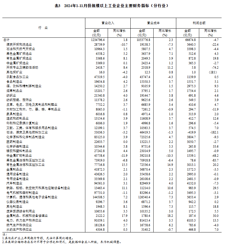 1至11月,规模以上工业企业实现营业收入123.48万亿元,同比增长1.8%,但营业成本也增长至105.38万亿元,涨幅为2.3%。营业收入利润率为5.40%,较去年同期下降了0.37个百分点。
