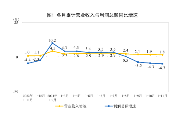 11月份,规模以上工业企业利润同比下降7.3%,但相较于上月,降幅已收窄2.7个百分点。国家统计局工业司统计师于卫宁指出,当月工业企业营业收入由降转增,利润降幅继续收窄,这标志着制造业高端化、智能化、绿色化的深入推进。随着政策效应的进一步释放,规模以上工业生产持续加快,带动企业当月营业收入同比增长0.5%,营业收入连续两个月回升。