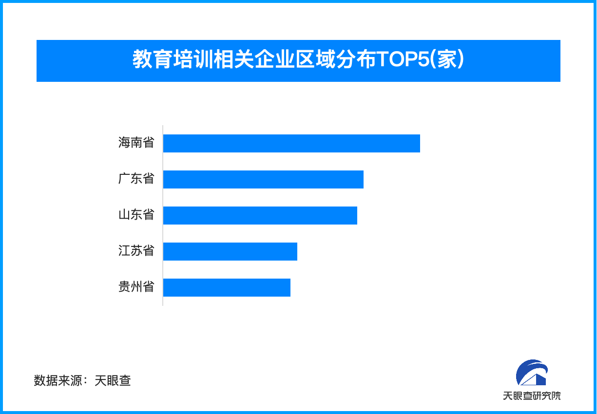 从地区分布来看,海南省拥有超40万家教育培训相关企业,占比13%,位居全国之首;广东省紧随其后,拥有超31万家企业;山东省、江苏省、贵州省也位列前五。