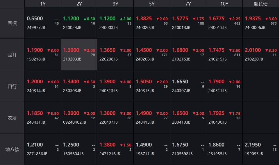 银行间市场方面,主要利率债收益率多数下行。截至北京时间16:30,10年期国债活跃券240011收益率下行2.25bp至1.6775%,30年期国债活跃券2400006收益率下行3bp至1.9375%,10年期国开活跃券240215收益率也下行2.5bp至1.7475%。