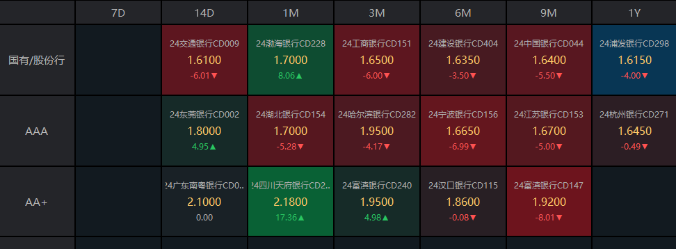存单方面,今日3M期国股在1.63%-1.71%位置需求较好,较前一日下行6bp;1Y期国股报在1.575%-1.68%的位置,较前一日下行4bp。AAA级存单方面,9M成交在1.67%,1Y成交在1.645%的位置。