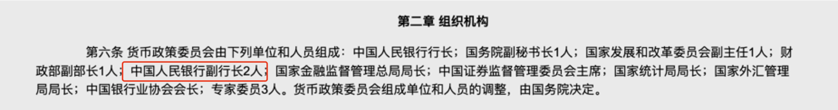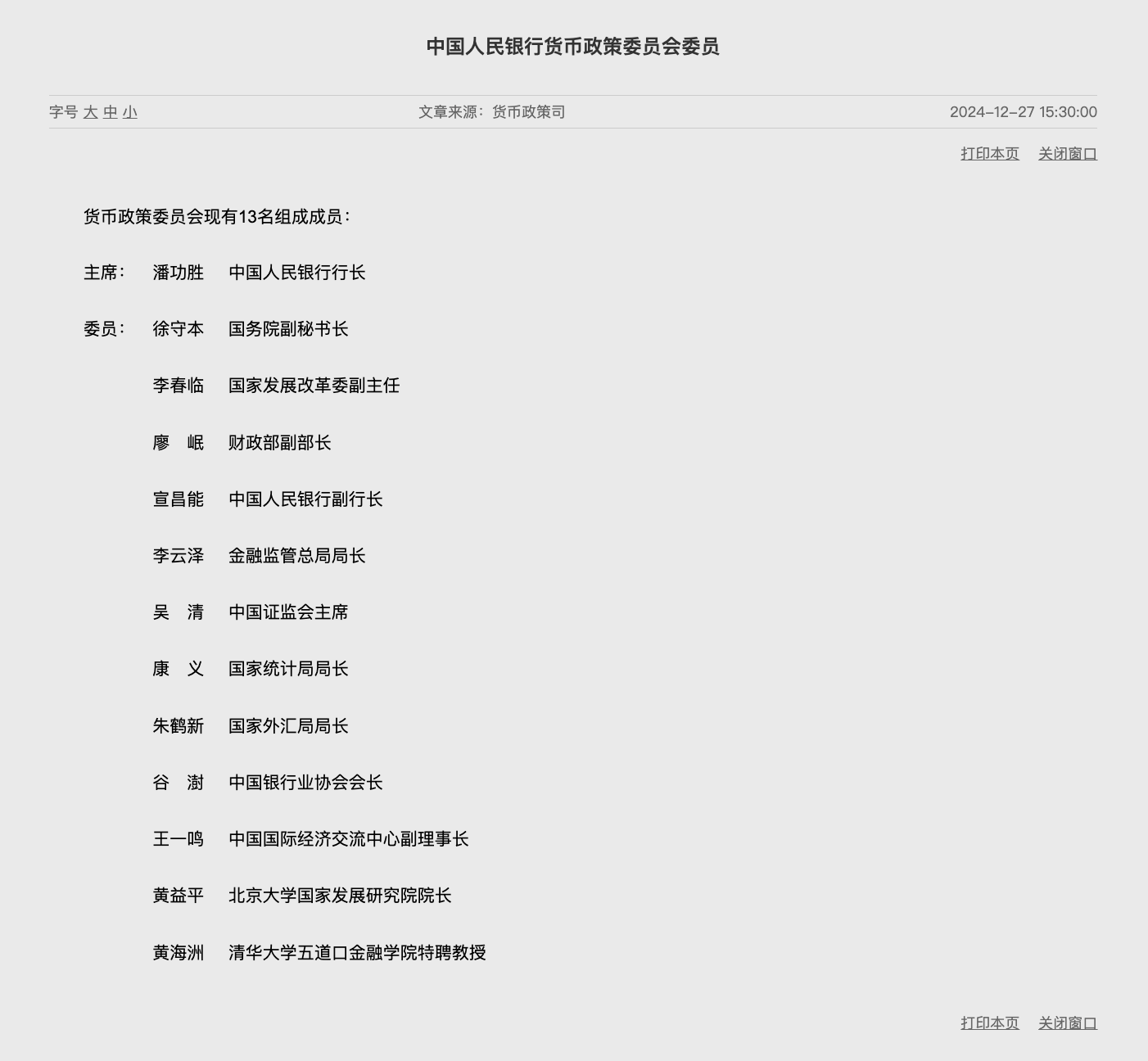 公开信息显示,原中国人民银行副行长张青松于2022年8月起担任该职务,并兼任货币政策委员会委员。今年11月,他被任命为中投公司董事长,因此不再担任货币政策委员会委员。