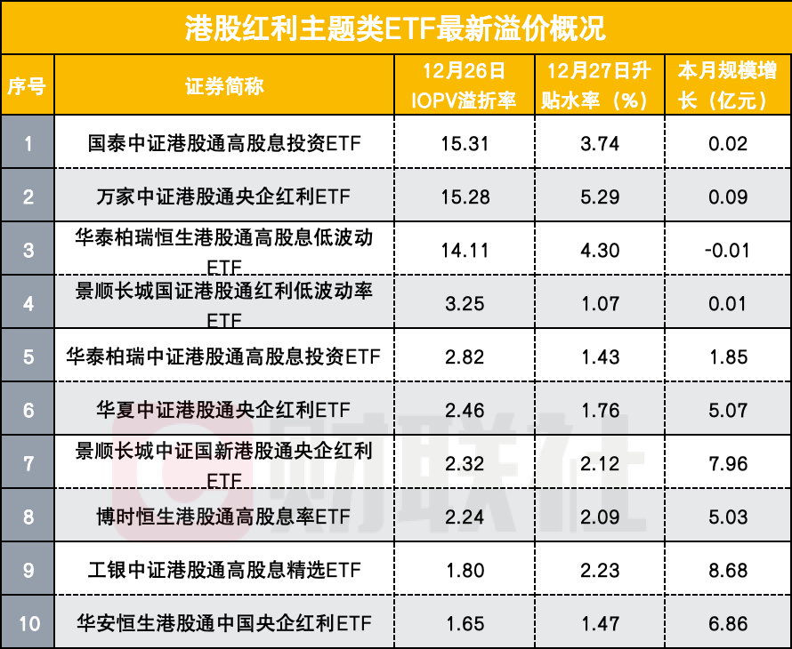 继昨日大涨之后,12月27日,三只专注于港股红利的ETF集体遭遇跌停,尽管如此,这些ETF在二级市场上仍呈现出一定程度的溢价现象。