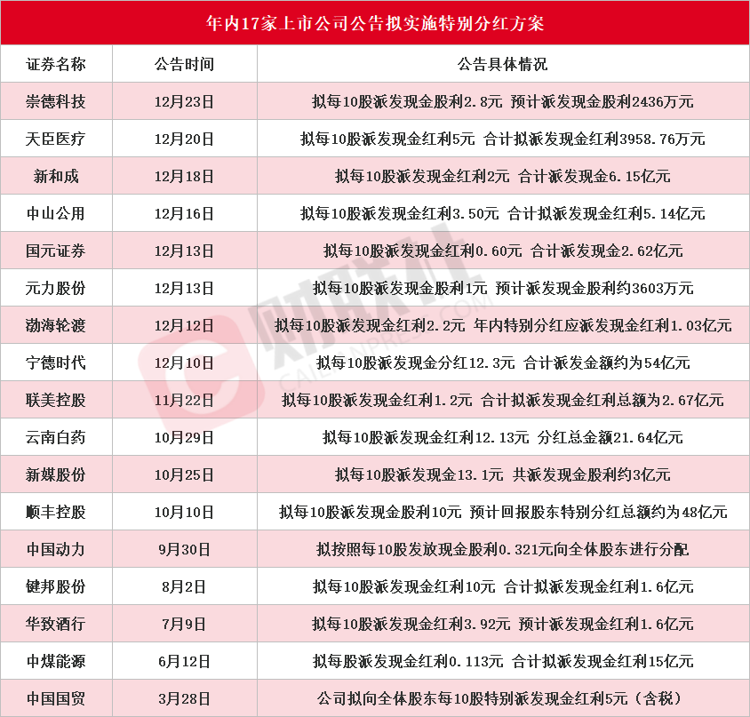 今年以来,A股上市公司分红积极性显著提升。据财联社不完全统计,截至当前,已有包括崇德科技、天臣医疗、新和成、中山公用、国元证券、元力股份、渤海轮渡、宁德时代、联美控股、云南白药、新媒股份、顺丰控股、中国动力、键邦股份、华致酒行、中煤能源和中国国贸在内的17家上市公司宣布了2024年的特别分红方案,这一数字创下了年度历史新高,远超2023年的7家。具体分红情况见下图。其中,宁德时代、云南白药、顺丰控股三家公司的特别分红金额预计超过20亿元。此外,敷尔佳、三只松鼠、秦安股份等上市公司也发布了春节前特别分红方案。