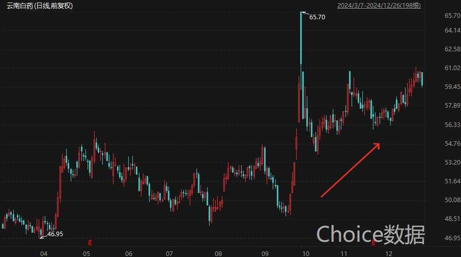 被誉为中药第一民族品牌的云南白药于10月29日发布公告称,公司将通过增加分红频次和优化分红节奏来增强投资者的获得感,提振投资者信心,并不断提升公司的内在价值和市场价值。公司拟向全体股东每10股派发现金红利12.13元(含税),分红总金额达到21.64亿元,占公司前三季度归母净利润的50.02%。在12月6日的调研中,云南白药表示公司始终注重持续合理回报投资者,与投资者共享企业发展成果。2023年,云南白药分红方案为每10股派息20.77元,现金分红总额达到37.06亿元,占2023年归母净利润比例的90.53%。公司已于2024年5月10日完成年度权益分派,而2024年特别分红方案也已于11月25日完成权益分派。自1993年上市至2024年,云南白药已连续31年对股东进行分红,累计现金分红金额超过265亿元。二级市场上,自2月低点以来,云南白药股价累计最大涨幅达到55.2%。