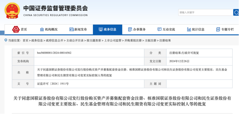 12月27日,国联证券与民生证券的并购交易在获得上交所“通过”意见后的短短10天内,再次获得了证监会的放行。这起备受瞩目的并购案以惊人的速度完成了所有审批流程,最终迎来了圆满的结局。