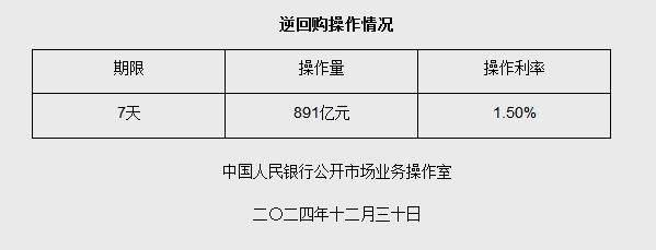 人民银行于2024年12月30日以固定利率、数量招标方式开展了891亿元逆回购操作,旨在保持银行体系流动性充裕,稳定市场预期,促进经济平稳运行。