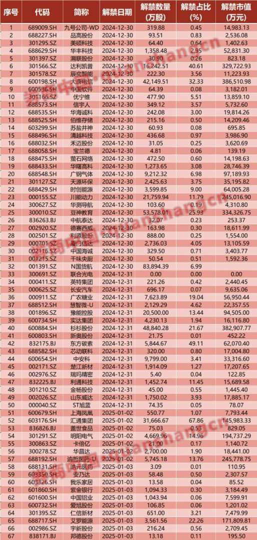 本周(12月30日到1月3日)A股市场将有67只股票面临限售股解禁,合计解禁市值为328.84亿元。其中大唐电信、杉杉股份、豆神教育、达利凯普的解禁市值将超过30亿元。