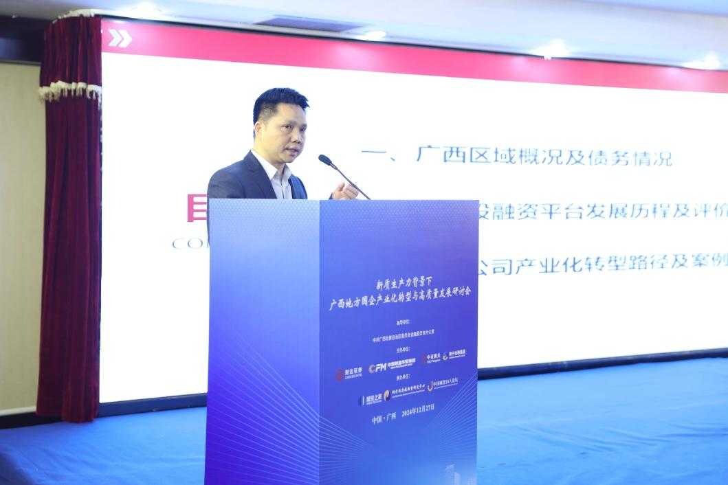 城投之家常务理事、财达证券企业融资部董事总经理黄雷在会上发布了《2024年广西壮族自治区地方政府投融资平台转型发展报告》,回顾了广西区域经济概况和国有企业现状,梳理了广西投融资平台的发展历程,并深入探讨了城投公司及相关国有企业产业化转型的路径。