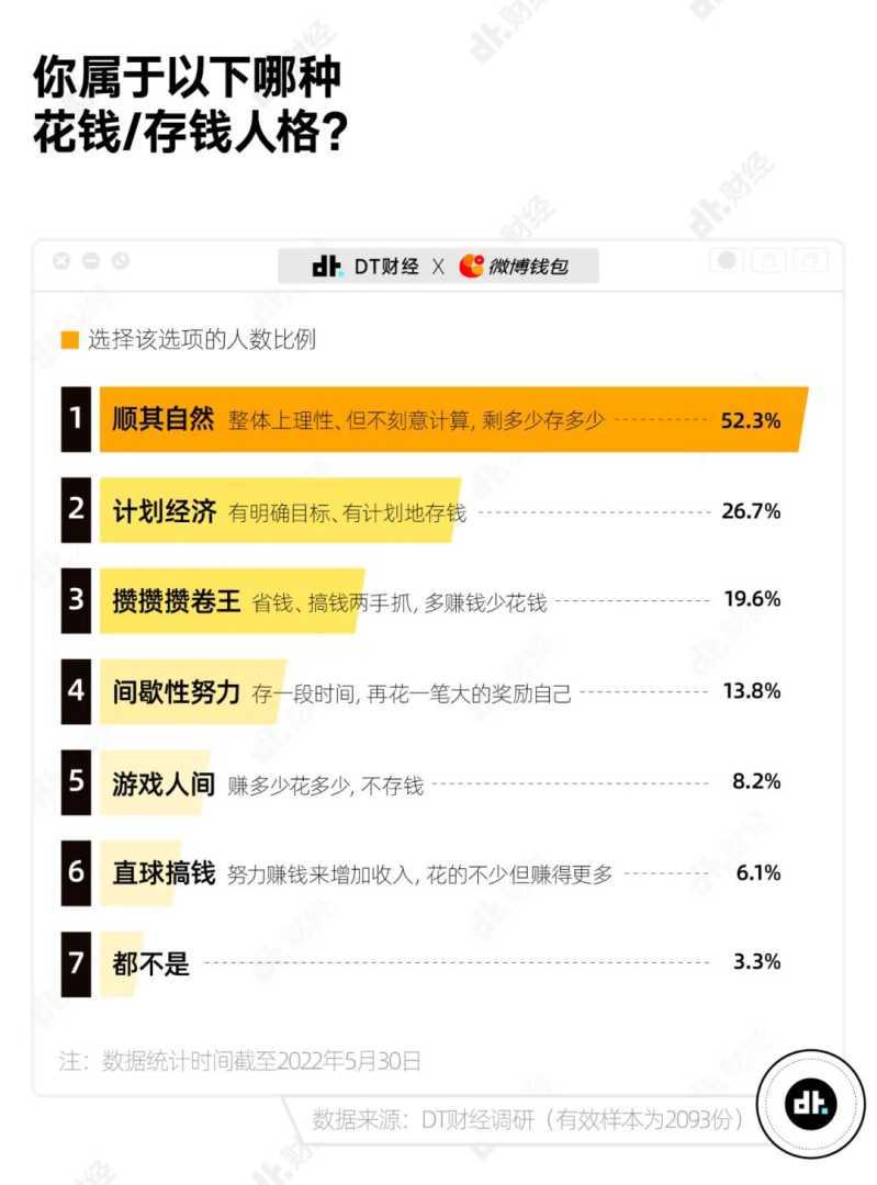 微博钱包联合DT财经近期发起的“国产青年攒钱小调研”揭示了当代年轻人钱包的真实状态。调研覆盖了超过2000名参与者,主要集中在大城市,且95后和00后占比超过一半。数据显示,职场新生代的主流理财人格是“顺其自然”,他们追求花钱与存钱的理性平衡,既不过分苛待自己,也不浪费金钱。