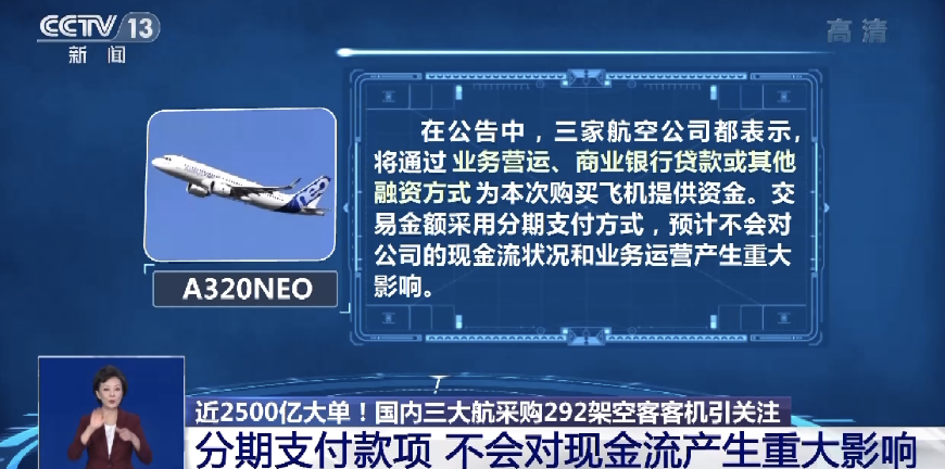 专家表示,飞机制造周期长,订单通常提前3-5年签订。此次订购的飞机将分年度、分批次交付。三大航均表示,购机资金无需一次性支付,将分期支付预付款,并于每架飞机交付时付清余款。资金将通过业务运营、银行贷款或其他融资方式筹集,预计不会对现金流和业务运营产生重大影响。