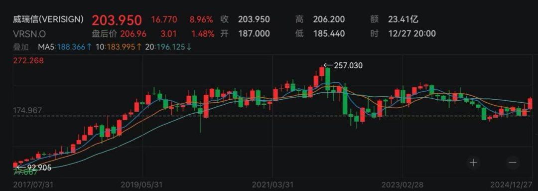 Wind数据显示,截至上周五收盘,VeriSign年初至今累计下跌0.98%,与标普500指数全年超过25%的涨幅形成鲜明对比。