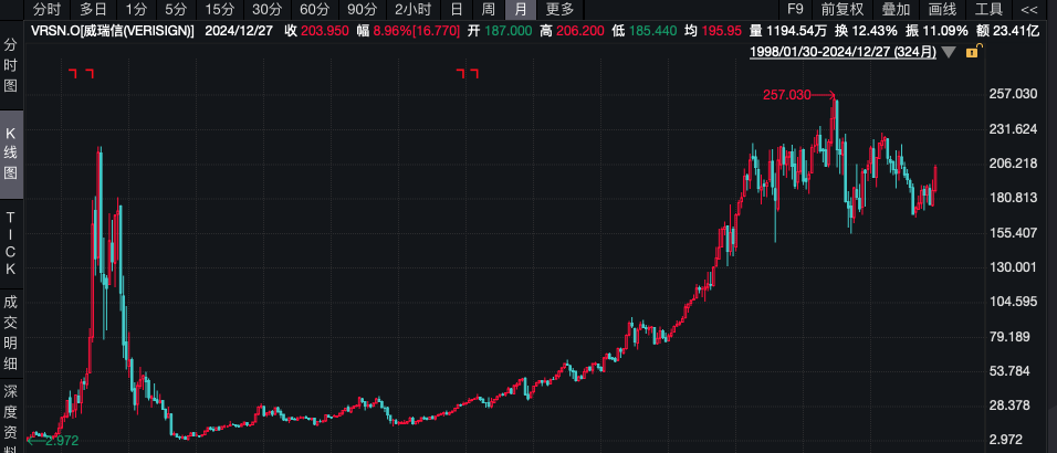 资料显示,VeriSign是一家专注于网际网络网域注册的公司(VRSN.US),主要负责管理.com和.net等顶级域名的注册服务,并在这个市场中占据最大的份额之一。其主营业务是域名使用年费,通过与ICANN(互联网名称与数字地址分配机构)和美国商务部的协议,每个.com/.net/.org等后缀的域名注册者都需要每年向VeriSign支付一定的年费。