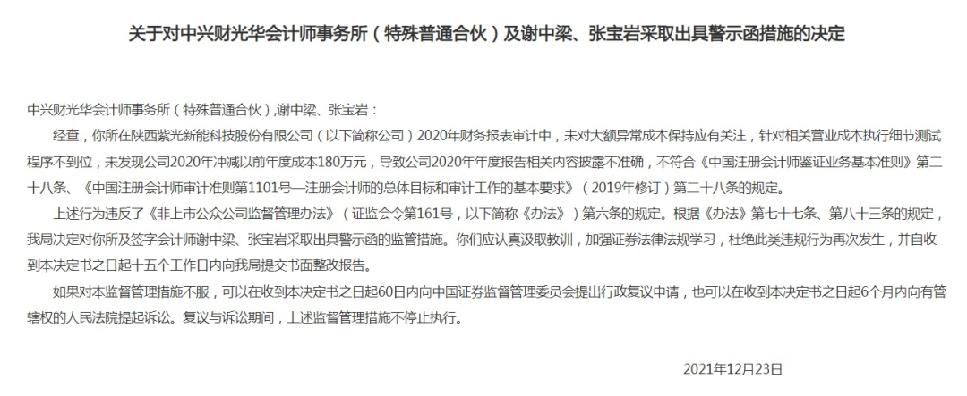 据记者梳理,中兴财光华会计师事务所在对紫光新能2020年财务报表进行审计时,未能对大额异常成本保持应有的关注,相关细节测试程序执行不到位,导致公司2020年年度报告相关内容披露不准确。因此,陕西证监局决定对中兴财光华会计师事务所及其签字会计师谢中梁、张宝岩采取出具警示函的监管措施。