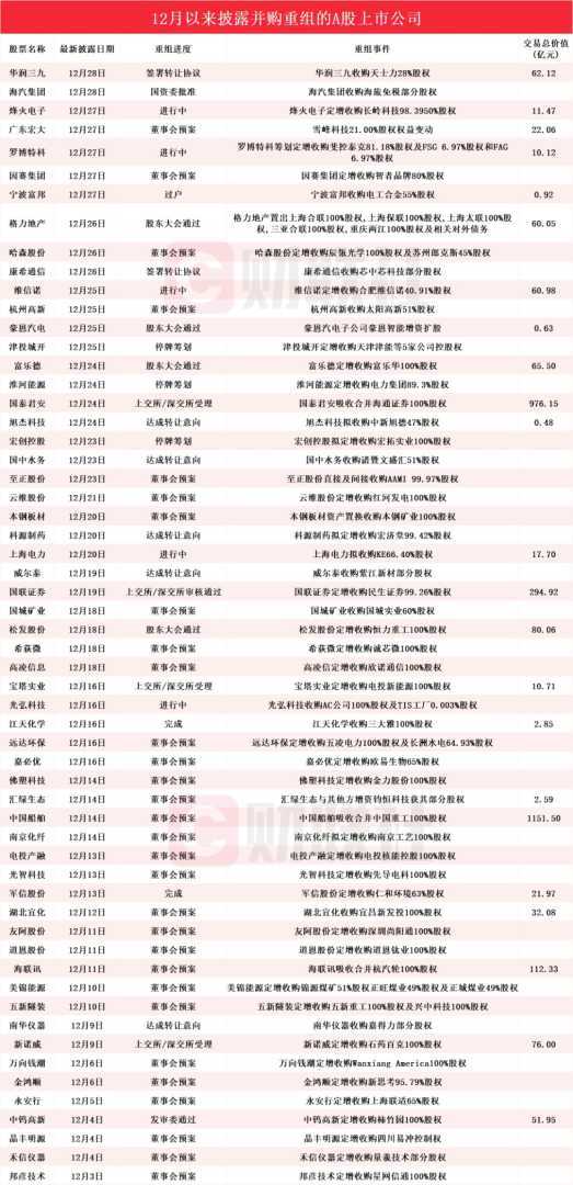 据统计,自12月以来,已有58家A股上市公司披露了并购重组的最新进展,包括华润三九、海汽集团、烽火电子、广东宏大、罗博特科等多家知名企业。这些公司的并购重组活动涵盖了多个行业领域,展现了资本市场的活跃与多样性。具体情况如下图所示: