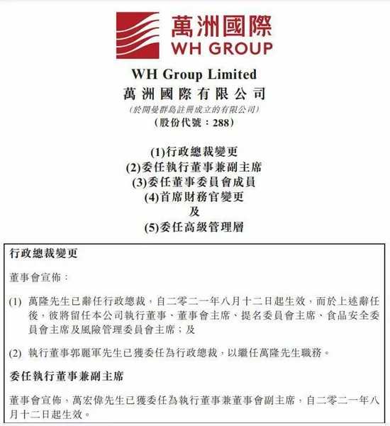 双汇母公司万洲国际高层人事变动,新任接班人已定!