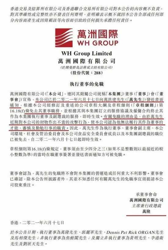 值得注意的是,此前被免去董事等职务的万隆长子万洪建,对此次人事变动给出了微妙的回应。他提醒新任副主席的弟弟万宏伟要步步小心,言语谨慎。而两个月前,万洲国际上演了一场“宫斗”戏码,万洪建被免去执行董事等职务。