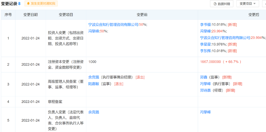 据天眼查信息显示,2022年1月24日,武汉众擎私募基金管理有限公司发生工商变更,新增股东包括李书福、李星星和李东辉,分别持股10.018%、19.976%和10.018%。公司原股东冯擎峰和宁波众合知行管理咨询有限公司的持股均降至29.994%。同时,武汉众擎私募基金的注册资本由1000万元增至1667万元,法定代表人由余克强变更为冯擎峰,高级管理人员也发生相应变化。