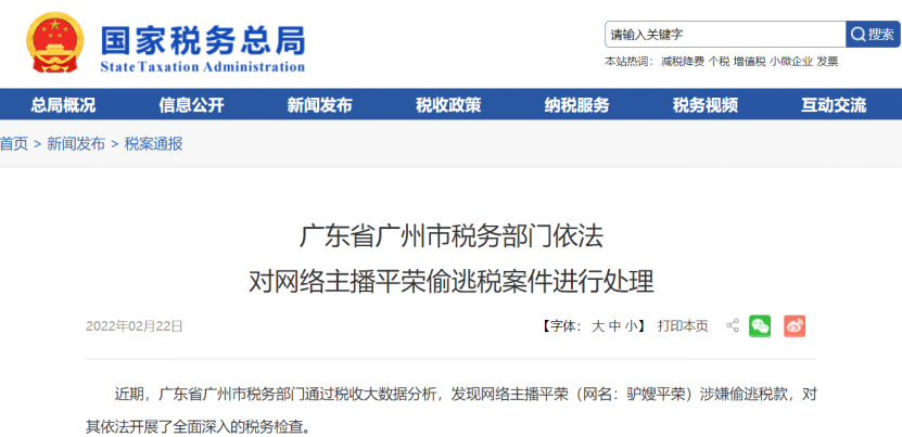 2月22日,国家税务总局通报,广东省广州市税务部门通过税收大数据分析,发现网络主播平荣(网名:驴嫂平荣)涉嫌偷逃税款,并随即对其进行了深入的税务检查。