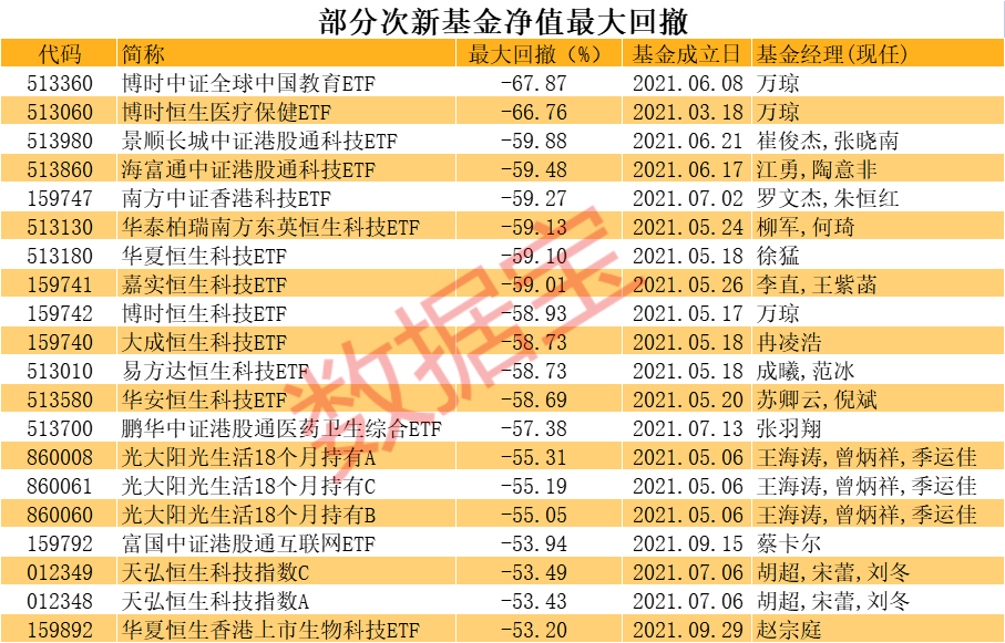 特别值得关注的是,去年6月8日成立的次新基金——博时中证全球中国教育ETF,在短短半年多时间内,净值已回撤近68%,成为最近一年成立的次新基金中亏损最大的。该基金最新净值为0.3214元(截至3月14日)。此外,还有11只QDII基金净值最大回撤超过60%,次新基金中更有20只净值最大回撤超50%。