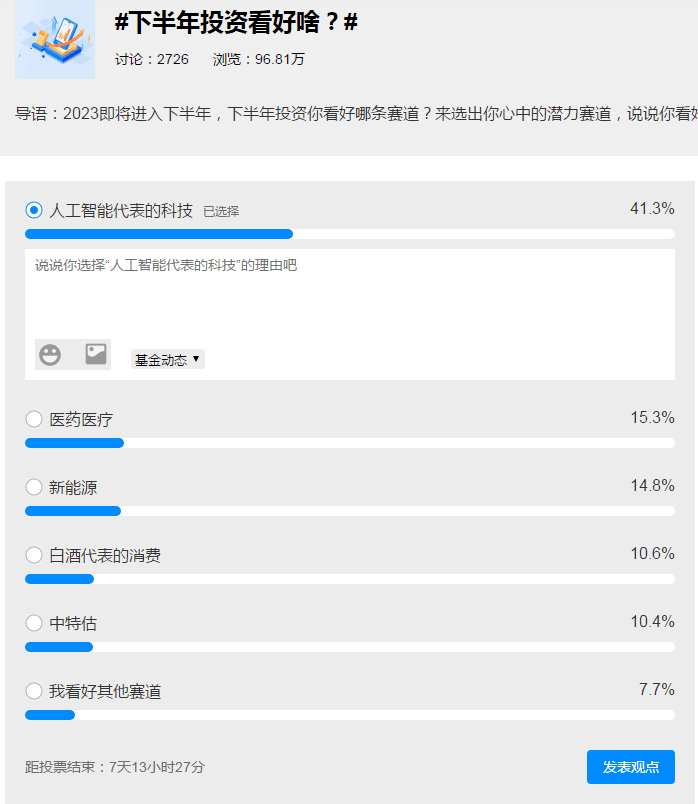 近日,天天基金网发起的“下半年投资看好啥”的投票活动,引发了广泛关注,参与人数逼近百万。投票结果显示,AI科技投资仍是下半年市场的主要投资机会,同时,医药、白酒消费、新能源等处于“低估”状态的板块也获得了不少投资者的青睐。