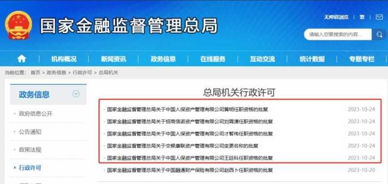 又一批保险资管公司高管任职资格获批,标志着保险资管行业迎来新一轮人事调整。10月24日下午,国家金融监管总局网站公示,黄明获批担任中国人保资产管理有限公司(简称“人保资产”)副总经理,才智伟获批担任人保资产董事,王廷科获批担任人保资产董事长,同时,刘霄潇获批担任招商信诺资产管理有限公司(简称“招商信诺资管”)副总经理。