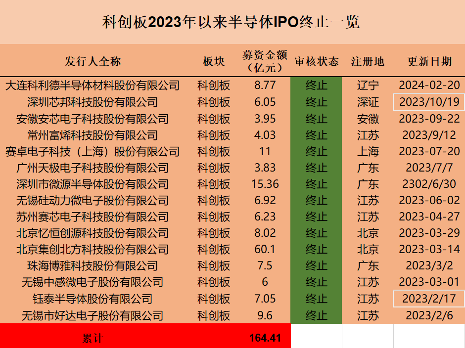 自2023年6月15日受理以来,科利德的科创板IPO经历了问询阶段,却在七个月后终止,成为龙年首例半导体IPO终止案例。这仅是2023年以来半导体公司上市难的缩影,去年以来,科创板与创业板合计终止的半导体IPO超过20单,涉及金额约250亿元。更多申报IPO的公司上市进展停滞在“已问询”阶段超过半年,能否成功上市存在较大不确定性。