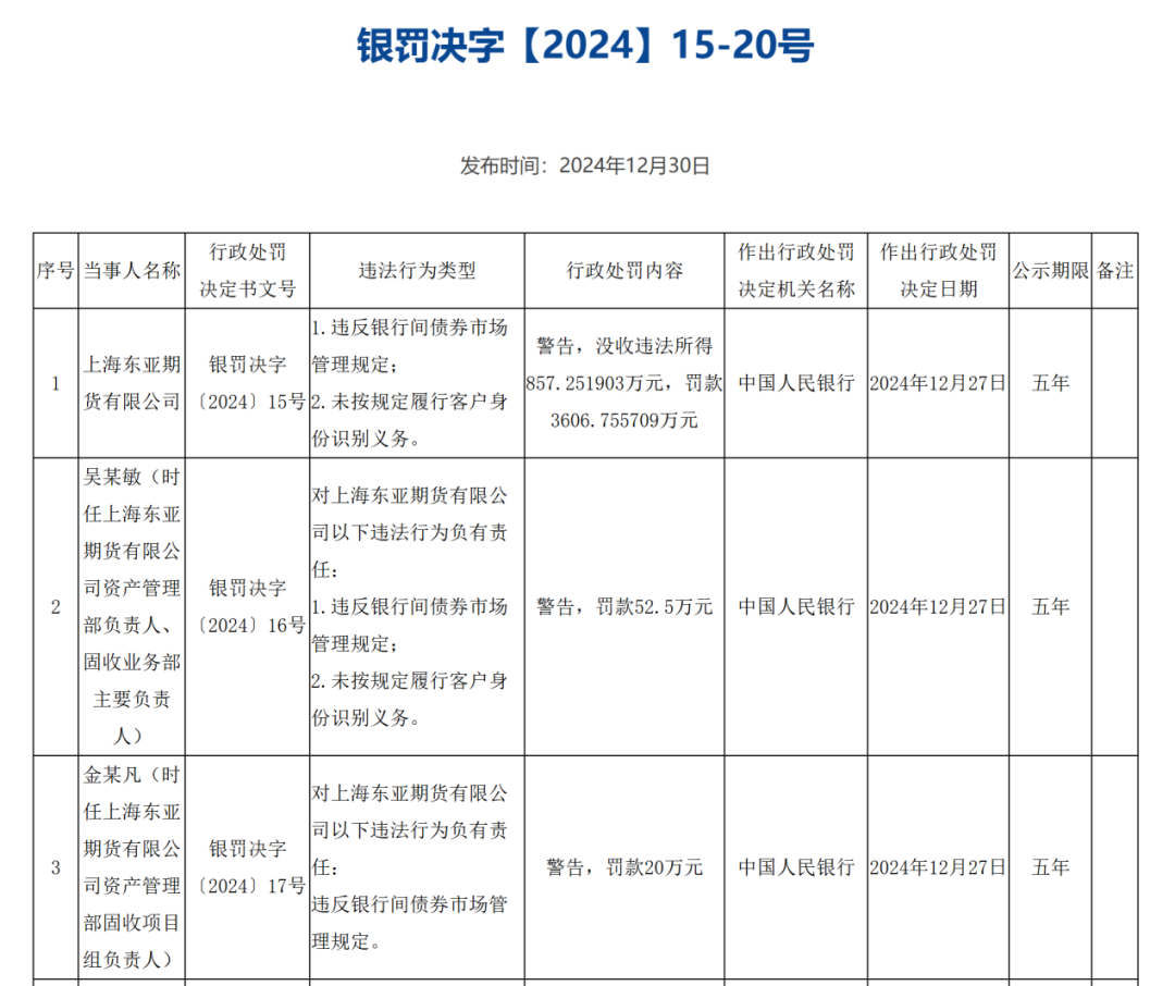 具体而言,上海东亚期货有限公司因违反银行间债券市场管理规定及未按规定履行客户身份识别义务,被警告并没收违法所得857.25万元,同时被罚款3606.76万元。相关责任人吴某敏、金某凡、唐某、董某菁及曹某均受到警告及不同额度的罚款。