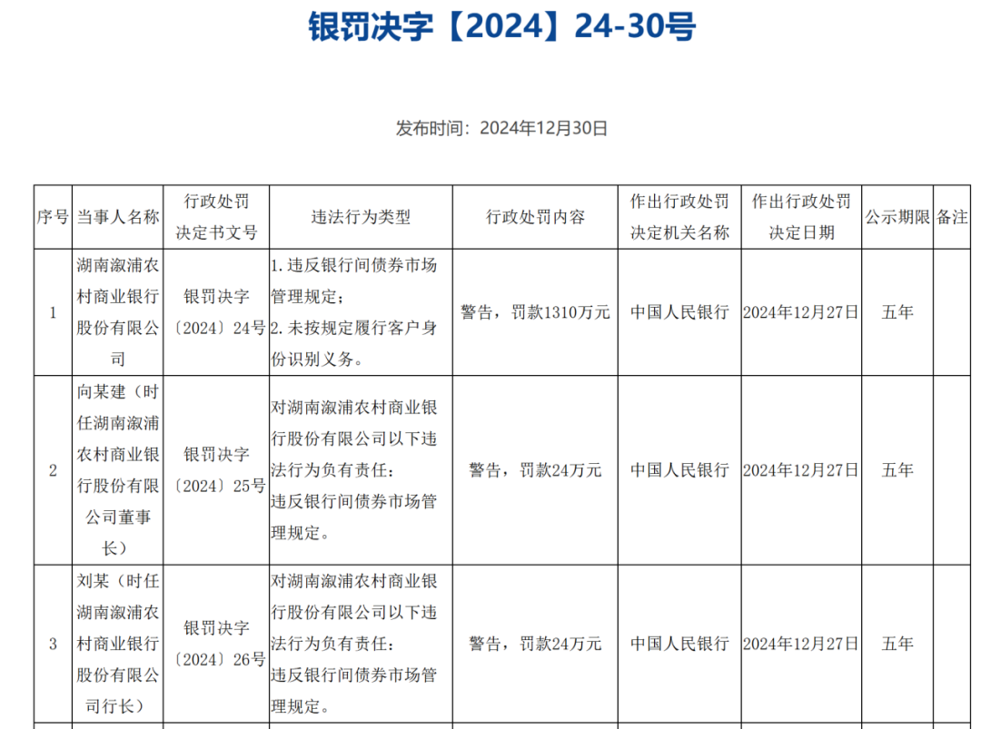 湖南溆浦农村商业银行股份有限公司也因类似违规行为被警告并罚款1310万元。该行董事长向某建、行长刘某、计划财务部员工熊某、计划财务部经理张某宇、内控合规部经理谌某林及运营科技管理部经理刘某均被警告并罚款。