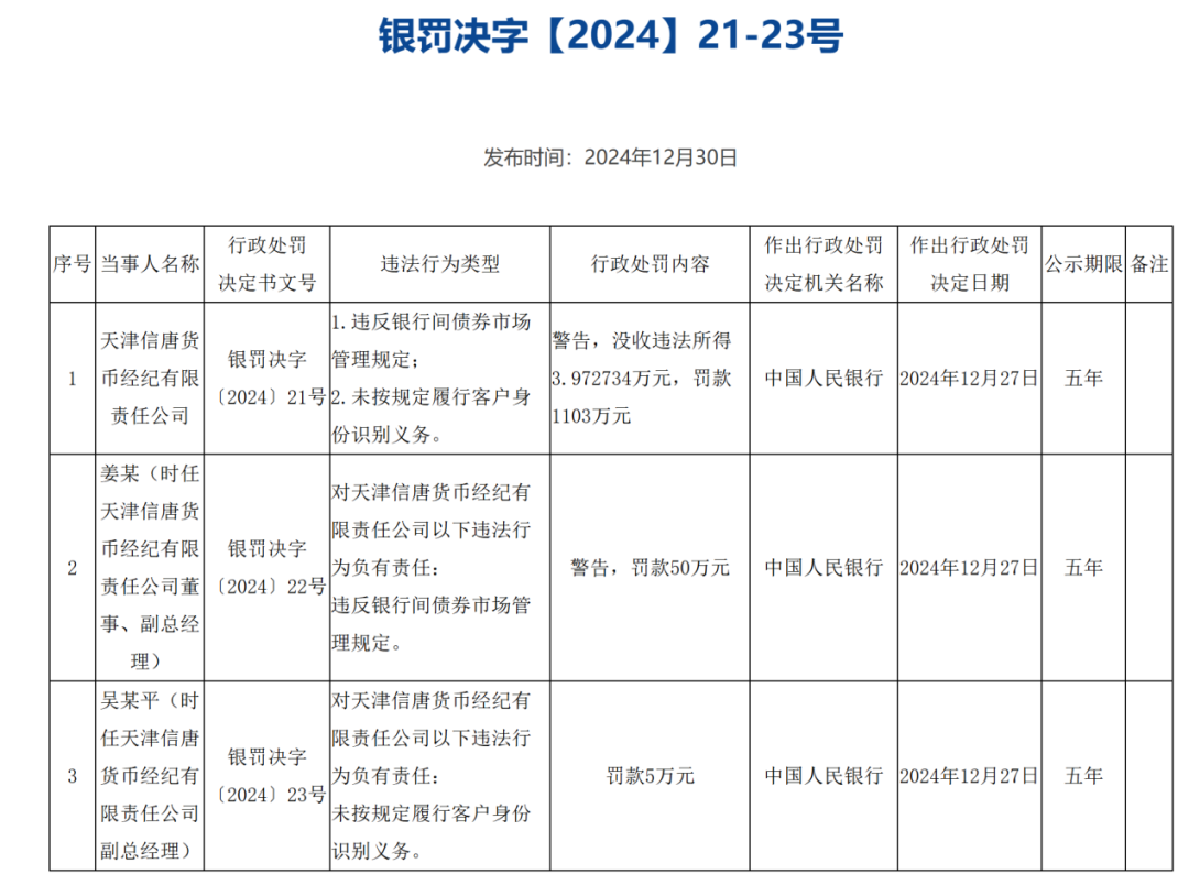 天津信唐货币经纪有限责任公司同样因违反银行间债券市场管理规定和未按规定履行客户身份识别义务,被警告并没收违法所得3.97万元,同时被罚款1103万元。该行董事姜某和副总经理吴某平也分别被罚款。