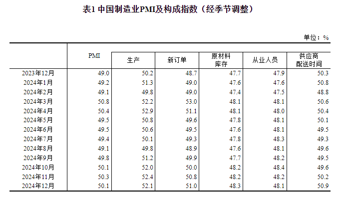 2024年12月份,中国制造业PMI录得50.1%,较上月微降0.2个百分点,但仍保持在扩张区间,显示出制造业活动持续稳步增长。