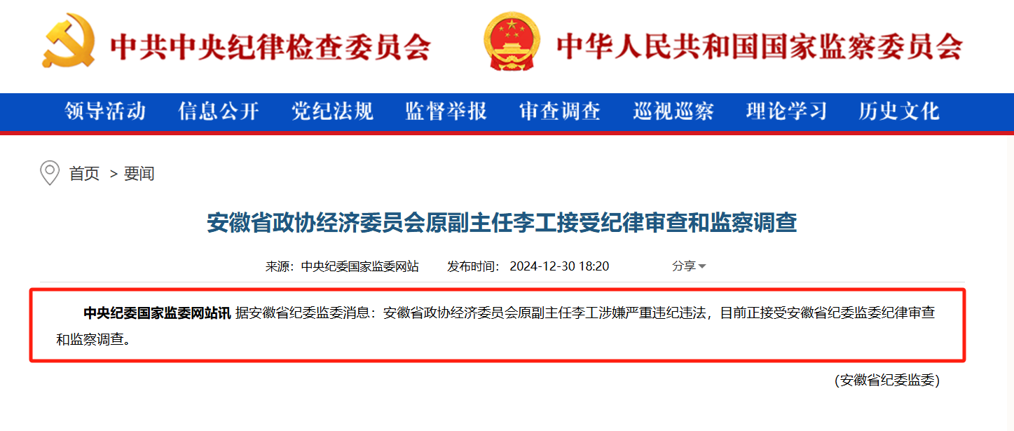 财联社12月31日讯(记者高艳云)12月30日,中央纪委国家监委官网通报,安徽省政协经济委员会原副主任李工因涉嫌严重违纪违法,正接受安徽省纪委监委的纪律审查和监察调查。李工曾在华安证券担任党委书记、董事长长达10年,对华安证券的发展有着重要影响。