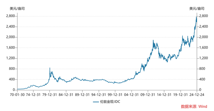 2024年以来,黄金价格不断攀升,屡次突破历史新高,成为表现最为突出的主要资产之一。在1月至11月期间,以美元计价的黄金回报率高达27.6%,远超美股、新兴市场股市、美债、美元现金以及商品等其他主要资产类别。尽管12月黄金价格有所回落,但仍保持在牛市通道中。从历史走势来看,自1970年至今,黄金价格已经历三轮显著的牛市(见图1)。