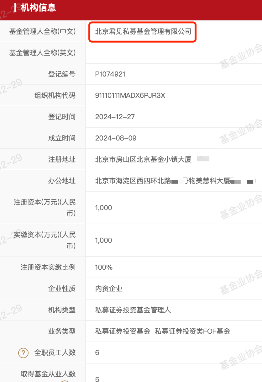 君见私募基金成立于2024年8月9日,注册资本1000万元,注册于北京市房山区,办公地位于北京市海淀区,目前拥有6名全职员工。公司出资人包括王亚军和陈栋,其中王亚军认缴资金比例为95%。
