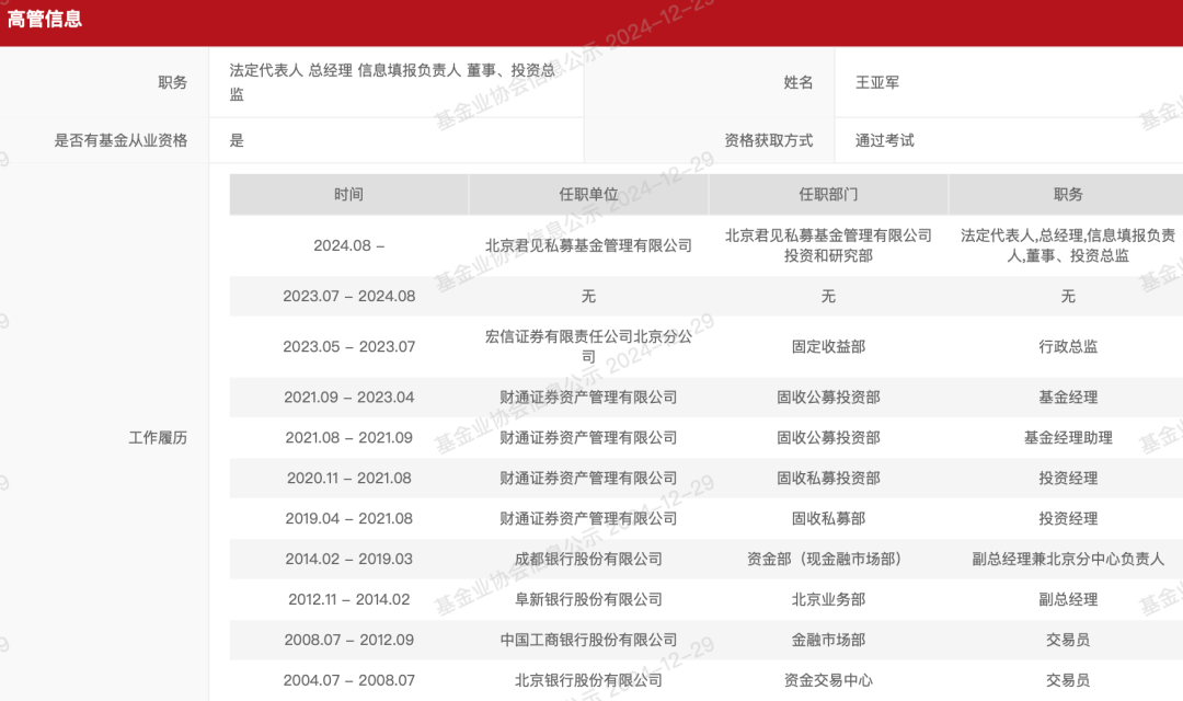 【导读】君见私募基金完成备案登记,其掌门人为财通资管原固收基金经理王亚军。