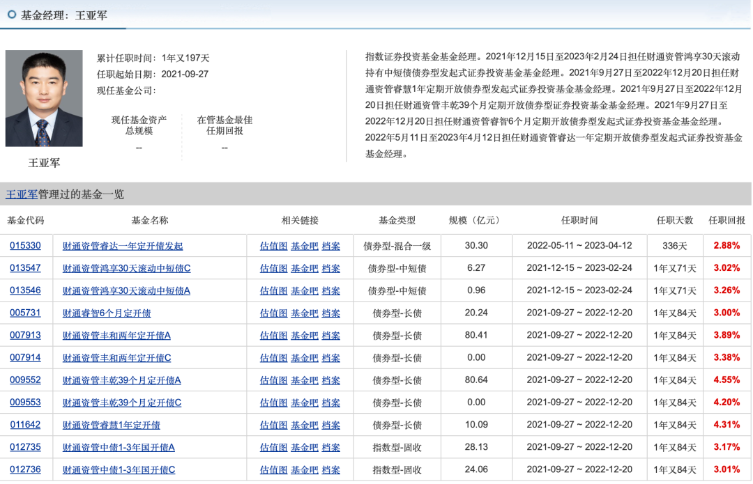 王亚军金融从业经历丰富,曾在北京银行、中国工商银行、阜新银行、成都银行等金融机构任职,2019年加入财通资管,担任固收私募部投资经理、固收公募投资部基金经理助理及基金经理,管理多只基金并取得正回报。2023年4月离职后,短暂就职于宏信证券北京分公司,同年创办君见私募基金。