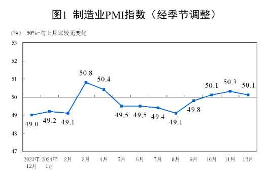 12月份,中国制造业PMI录得50.1%,较上月微降0.2个百分点,但仍保持在扩张区间,显示出制造业活动持续扩大。大型企业PMI为50.5%,中型为50.7%,均高于临界点,而小型企业PMI为48.5%,略低于临界点。