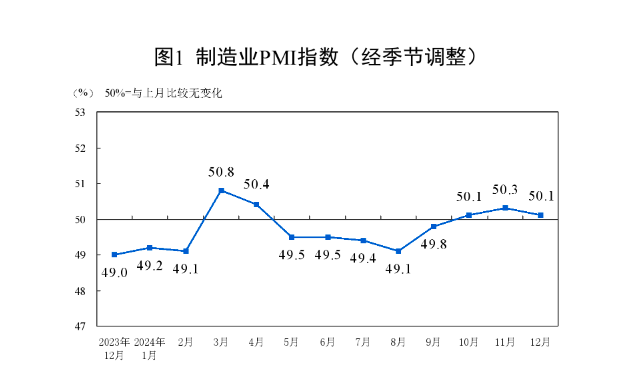 随着宏观政策组合效应的持续显现,制造业PMI已连续三个月稳居景气区间。国家统计局12月31日公布的数据显示,12月份制造业采购经理指数为50.1%,较上月微降0.2个百分点;非制造业商务活动指数和综合PMI产出指数则分别为52.2%,分别较上月上升2.2和1.4个百分点,均处于扩张区间,表明企业生产经营活动正在加快,我国经济景气水平持续回升。