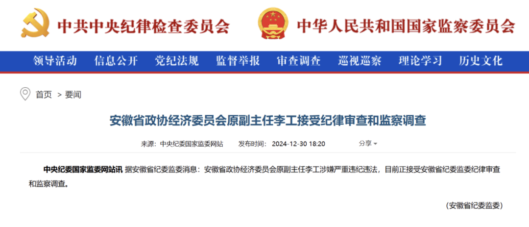 近日,中央纪委国家监委官网通报,安徽省政协经济委员会原副主任李工因涉嫌严重违纪违法,正在接受安徽省纪委监委的纪律审查和监察调查。