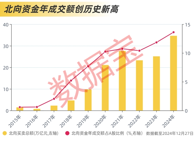 据证券时报·数据宝统计,截至12月27日,2024年北向资金合计买卖总额达到34.63万亿元,同比增长37.85%,创历史新高。北上资金成交金额占A股成交额比例提升至13.61%,同样创历史新高。其中,10月和11月买卖总额持续维持在4万亿元以上,单日最高成交额达5101.01亿元。