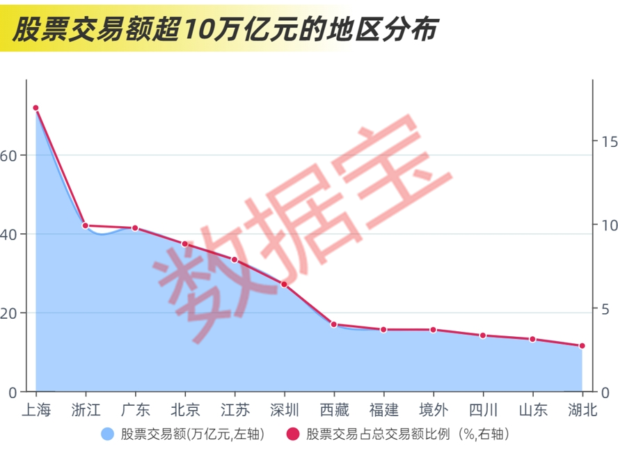 2024年,沿海地区投资者积极性较高,上海、广东、北京、江苏的总交易额均超百万亿元,占全国比例合计达60.48%。在各类投资品种中,上海地区的股票、基金、债券、期权等交易占比均领先。股票交易中,上海、浙江、广东位居前三,合计占比达36.58%。