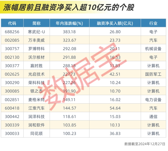 个股方面,东方财富等52股融资净买入额超10亿元,其中13股股价涨幅超100%,寒武纪-U年内股价涨幅更是高达383.18%。