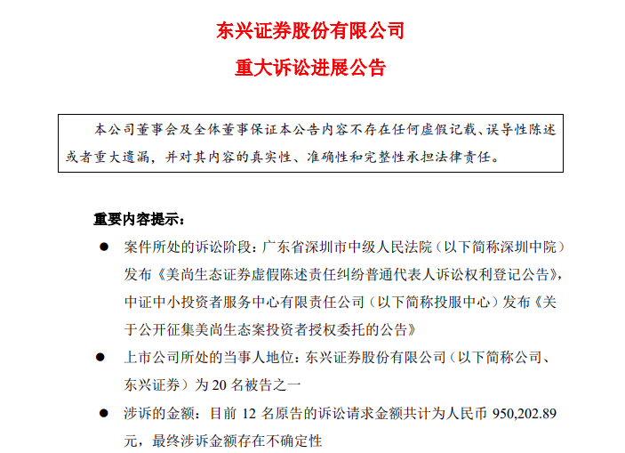 广发证券、东兴证券被起诉与美尚生态财务造假有关,共涉及20名被告,被12名原告提出诉讼请求金额共计95.02万元。案件已决定适用普通代表人诉讼程序审理,符合条件的投资者需在2025年1月27日前登记加入诉讼。美尚生态成立于2001年,2015年在深交所上市,期间合计虚增净利润4.57亿元。