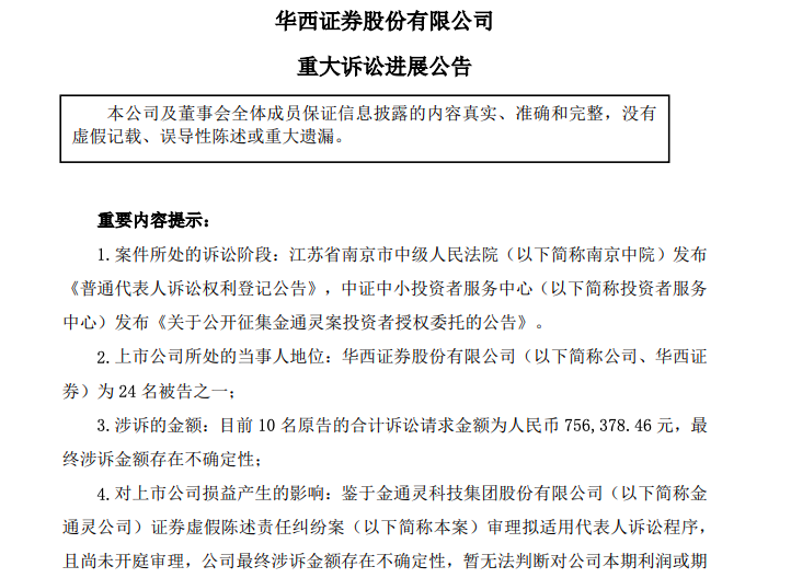 另一方面,华西证券、光大证券和国海证券涉及的金通灵证券虚假陈述责任纠纷案中,10名自然人投资者对金通灵公司及相关券商等24名被告提起诉讼,诉讼请求金额合计为75.64万元。案件同样决定适用普通代表人诉讼程序审理。投资者服务中心公开征集投资者授权委托,并计划转换特别代表人诉讼。