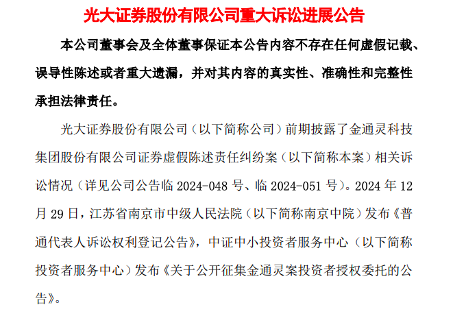 12月30日晚间,广发证券、东兴证券、光大证券、国海证券、华西证券同日披露了重大诉讼最新进展,涉及美尚生态和金通灵证券虚假陈述责任纠纷案,投资者服务中心公开征集投资者授权委托,计划转换特别代表人诉讼。