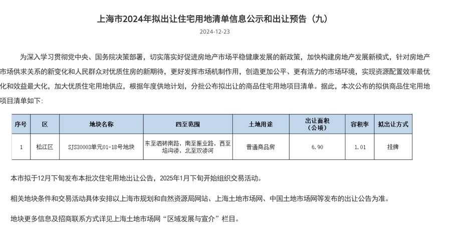 据悉,该地块位于松江洞泾板块,容积率仅约1.01,距离在建的12号线西延伸线同乐路站约1.6公里。