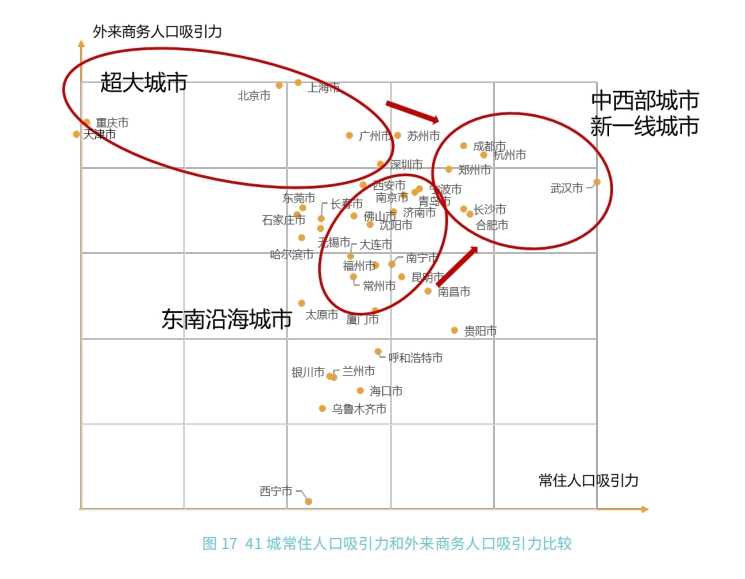 在41个城市中,常住人口和外来商务人口吸引力均较强的六个城市,除杭州外均为新一线城市,包括武汉、成都、郑州、长沙和合肥。这些城市在吸引人口方面表现突出,成为全国城市发展的亮点。