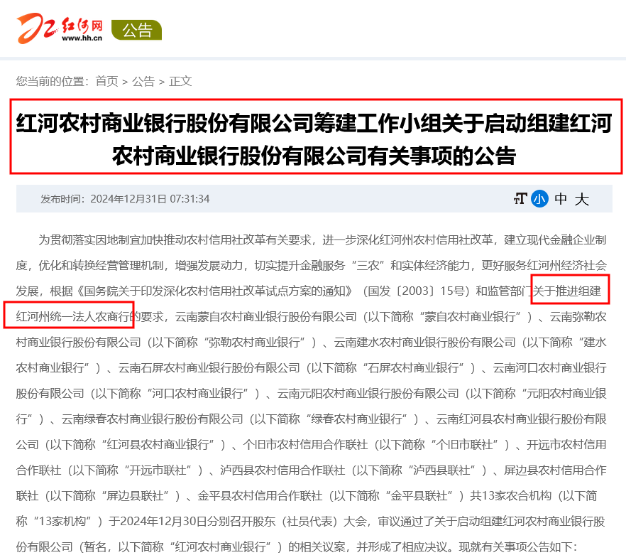 公告中提到,依据《国务院关于印发深化农村信用社改革试点方案的通知》和监管部门的相关要求,云南蒙自农村商业银行股份有限公司等13家农合机构于2024年12月30日分别召开股东(社员代表)大会,审议并通过了关于红河农村商业银行股份有限公司(暂名)的组建议案,形成了明确的决议。这标志着红河州在深化农信体系改革方面迈出了重要一步。