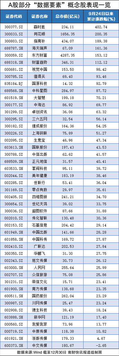 据统计,自“9·24”行情以来,截至12月30日收盘,数据要素指数(8841665.WI)累计涨幅达到了58.79%。其中,46只成分股的平均涨幅超过了60%,涨幅居前的包括赢时胜(300377.SZ)、同花顺(300033.SZ)及指南针(300803.SZ)。