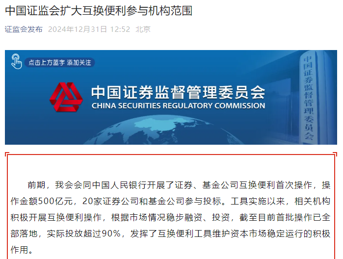 为深入贯彻中央经济工作会议精神和全国金融系统工作会议要求,相关机构积极申请参与,中国证监会与中国人民银行在首批20家参与机构的基础上,根据分类评价、合规风控等条件,增选了20家机构,形成了40家备选机构池。每批次操作时,将根据意向参与规模筛选出约20家机构参与人民银行的招标操作。目前,第二次互换便利操作的各项准备工作已经就绪,并已正式开始操作。中国证监会要求相关机构充分发挥专业投资能力,加强合规风控管理,有效发挥稳市货币政策工具的功能,加强和改善市场预期管理,共同推动资本市场稳定健康发展。
